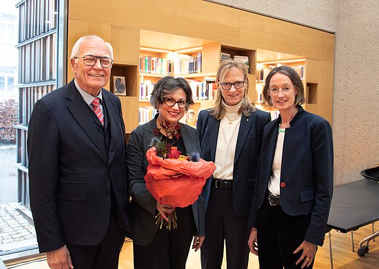 Studierende im Kreis stehend, unterhalten sich vor Unigebäude, auf einer Bank