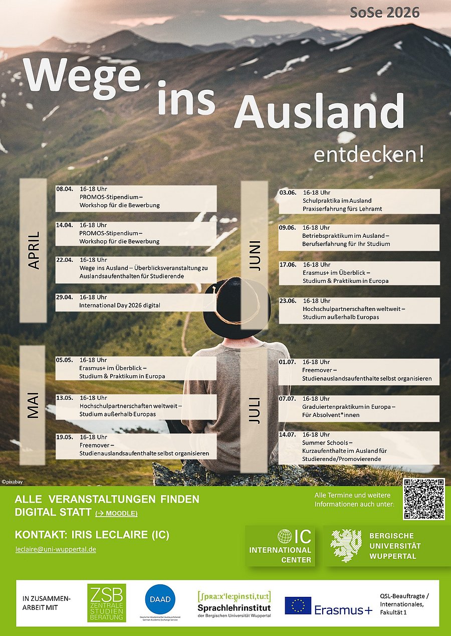 In der heutigen Arbeitswelt sind insbesondere Praktika sowie Auslandserfahrung während des Studiums von besonderem Interesse für den potenziellen Arbeitgeber. Warum also nicht beide Anforderungen miteinander kombinieren und ein Praktikum im Ausland absolvieren? Was hierbei zu beachten ist und welche Programme Praktika im Ausland unterstützen oder vermitteln, stellen wir Ihnen in dieser Informationsveranstaltung vor.