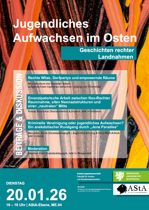 Termin: „Jugendliches Aufwachsen im Osten. Geschichten rechter Landnahmen“, Dienstag, 20. Januar 2026, 16 bis 18 Uhr, AStA-Ebene (Gebäude ME, Ebene 04)
