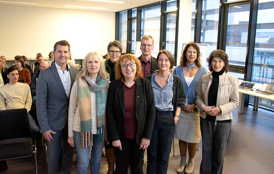 Arbeiteten rund viereinhalb Jahre an der Entwicklung und Umsetzung digitaler und hybrider Lernformate (v.l.n.r.): Prof. Dr. Nils Crasselt, Prof. Dr. Angela Preisfeld, Prof. Dr. Vivien Heller, Prof. Dr. Susanne Buch, Prof. Dr.-Ing. Dietmar Tutsch, Prof. Dr. Claudia Schrader, Prof. Dr. Anne-Rose Meyer-Eisenhut und Prof. Dr. Svetlana Petrova. // Foto Friederike von Heyden