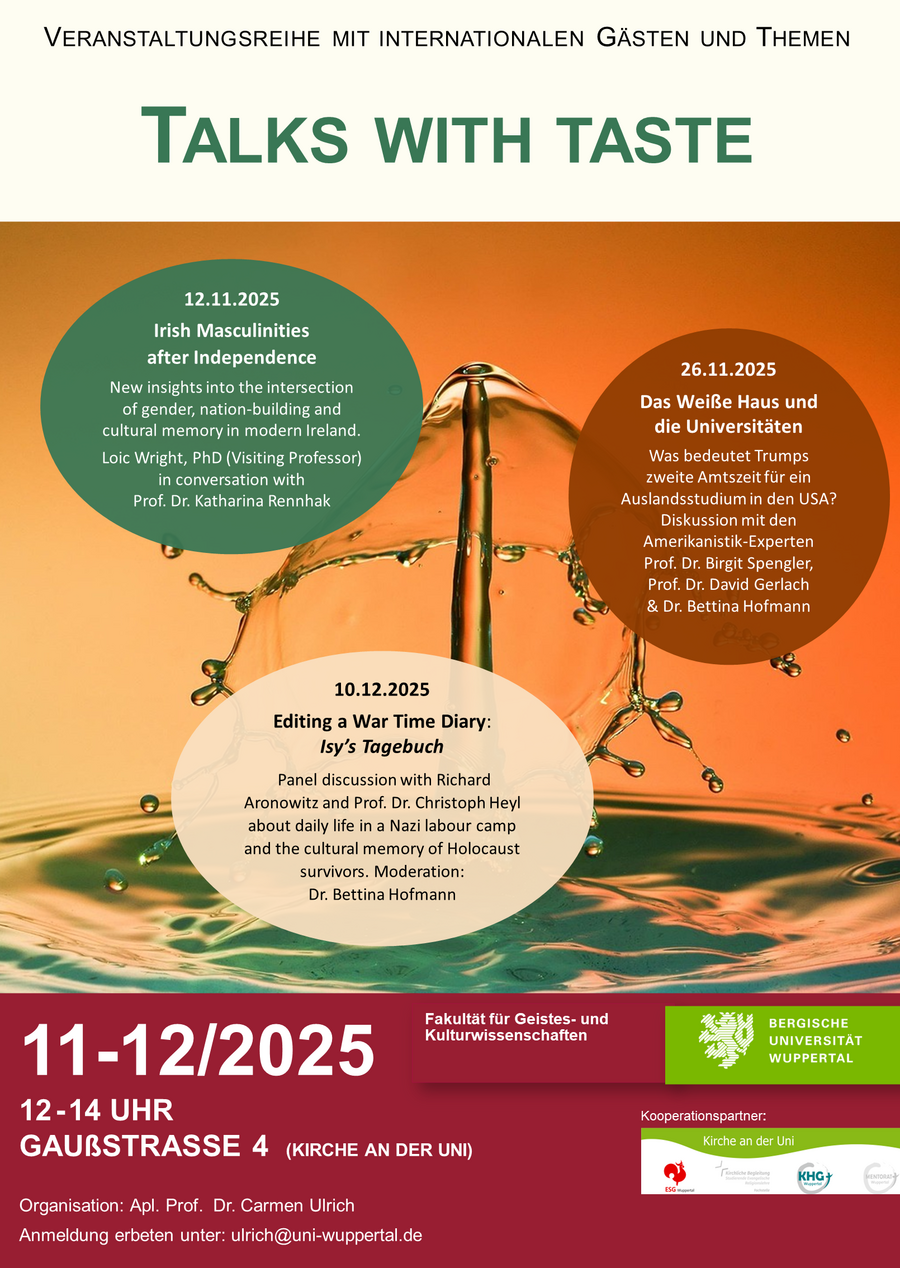 Grundlage für das Gespräch ist das Tagebuch von Isy Aronowitz, der in Wuppertal in einer jüdischen Familie aufwuchs und 1938 im Alter von 25 Jahren deportiert wurde. In seinem Tagebuch hielt er seine Zeit in zwei Arbeitslagern fest. Christoph Heyl hat nun eine Ausgabe des gesamten Tagebuchs mit einem Vorwort von Isys Großneffen – Richard Aronowitz – veröffentlicht. Zu Gast bei „Talks with taste“ nehmen die beiden die Veranstaltungsteilnehmenden mit in die Geschichte der Familie Aronowitz. Die Einführung und Moderation übernimmt Dr. Bettina Hofmann (BUW).