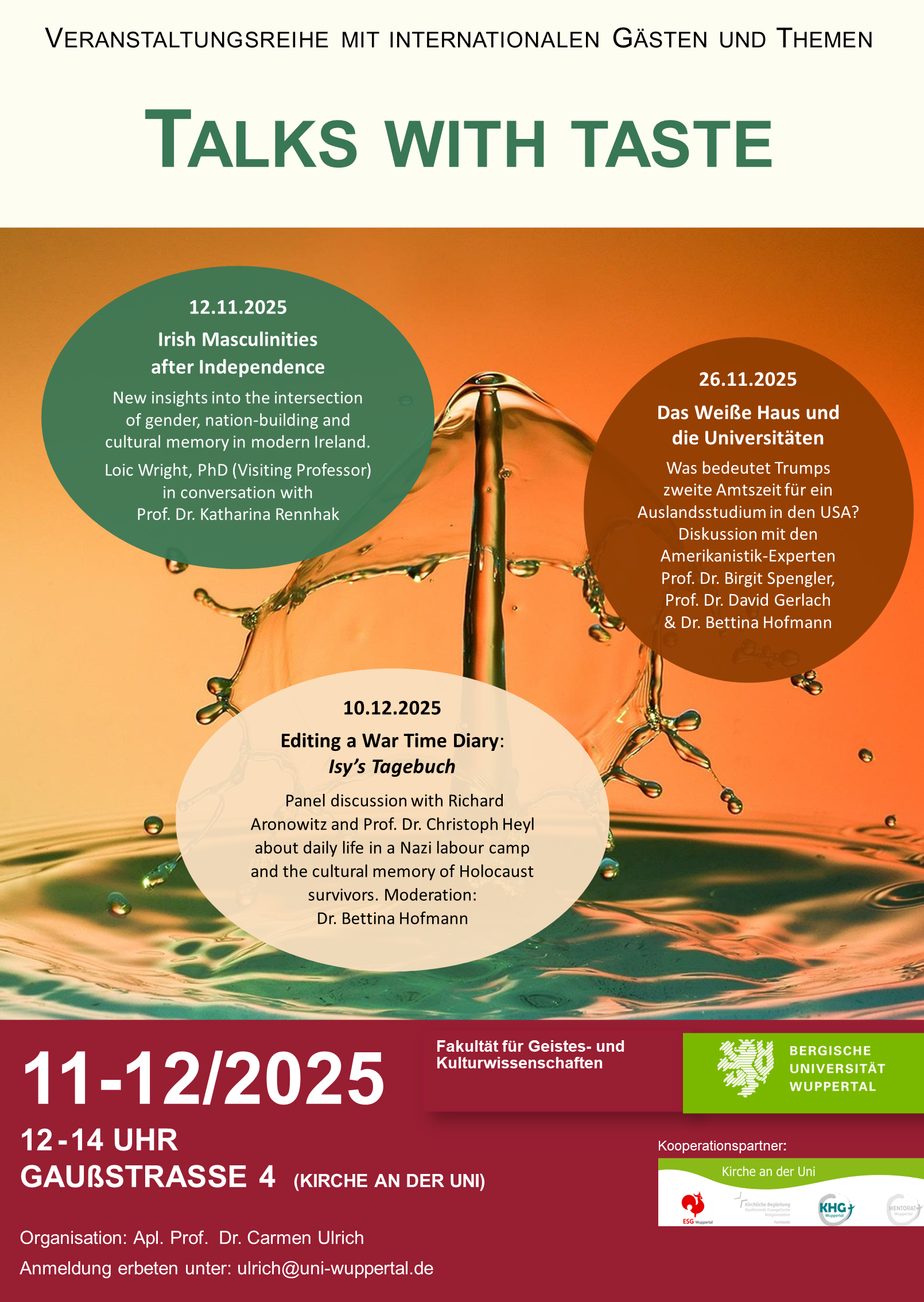 Die Organisator*innen von „Talks with taste“ laden ein zu Vorträgen, Interviews und Podiumsgesprächen mit Wissenschaftler*innen aus dem In- und Ausland. „Wissenschaft bedeutet Offenheit, Neugier und gegenseitige Inspiration. Durch die Auseinandersetzung mit unterschiedlichen Sichtweisen auf Themen lernen wir, uns besser zu verstehen und uns wirkungsvoll zu vernetzen“, erklärt Initiatorin apl. Prof. Dr. Carmen Ulrich aus der Fakultät für Geistes- und Kulturwissenschaften.