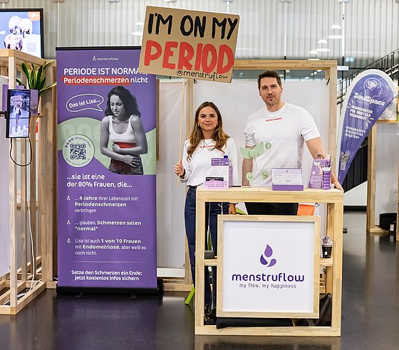„I'm on my Period“, verkündete das Schild, mit dem die Gründerin Polina Sergeeva die Bühne für ihre Keynote betrat. Mit ihrer Gründung von menstruflow widmet auch sie sich dem Thema Menstruation. Sie ist das Gesicht der Marke und nutzt ihre Reichweite gezielt, um auf das Thema Periodenschmerz aufmerksam zu machen.