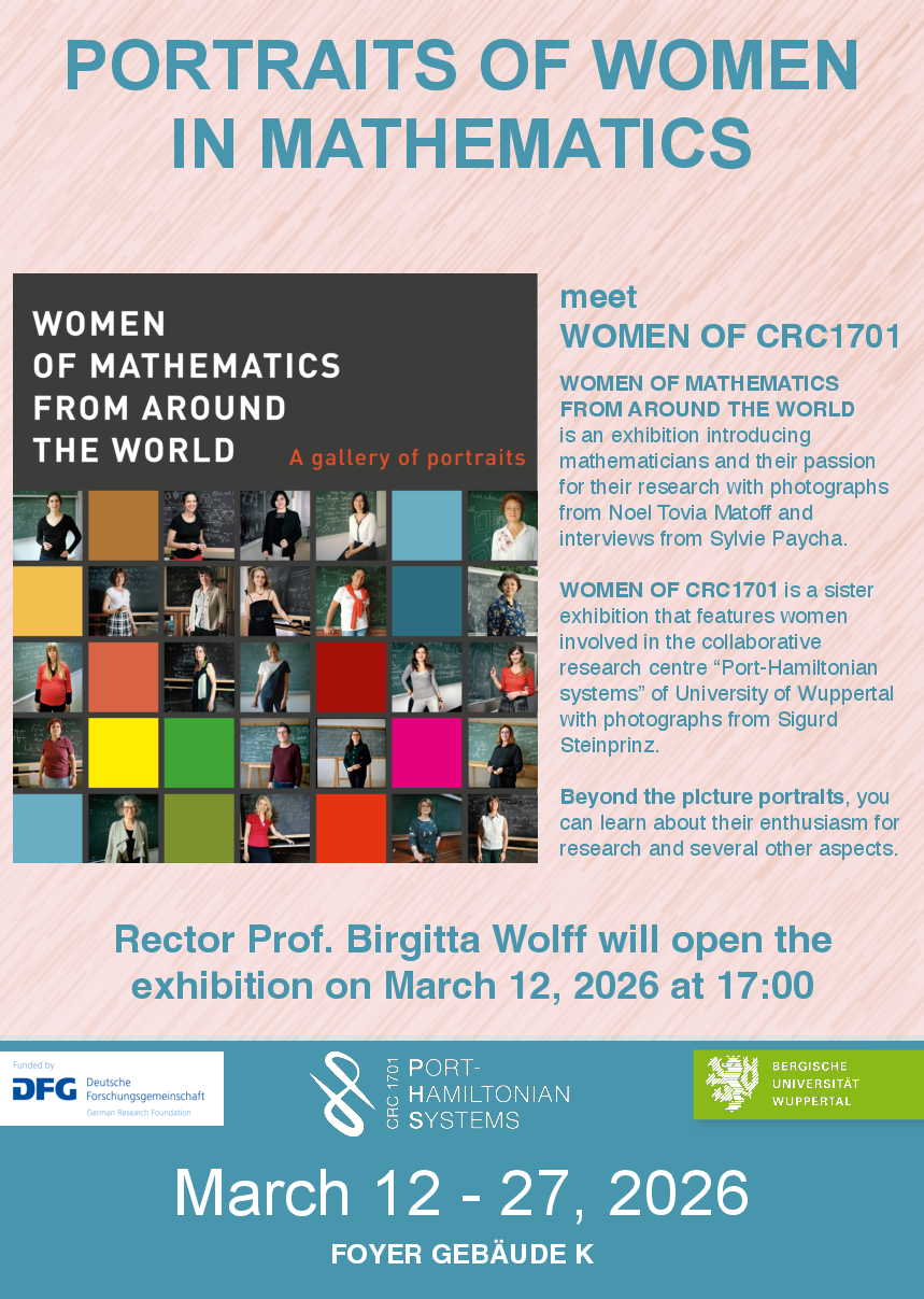 Ein weiterer Höhepunkt ist die am 12. März startende Begleitausstellung „Women in Mathematics“ („Frauen in der Mathematik“) auf dem Campus Grifflenberg (Gaußstraße 20) im Foyer von Gebäude K (Eröffnung 17 Uhr). Sie zeigt Mathematikerinnen aus der ganzen Welt und ihre Leidenschaft für ihre Forschung mit Fotografien von Noel Tovia Matoff und Interviews von Sylvie Paycha. An der Uni Wuppertal wird das internationale Porträt-Projekt um eine besondere Fotoarbeit erweitert: Vorgestellt werden dabei 13 Frauen, die gemeinsam im Sonderforschungsbereich „Port-Hamiltonian Systems“ forschen. Gezeigt werden Fotos von Sigurd Steinprinz. Daneben erfahren die Besucher*innen auch viel Persönliches über die Wissenschaftlerinnen: zum Beispiel, dass mathematische Probleme süchtig machen können, Zweifel normal und weibliche Vorbilder in der Mathematik wichtig sind. Zu sehen sind die Porträts bis zum 27. März.
