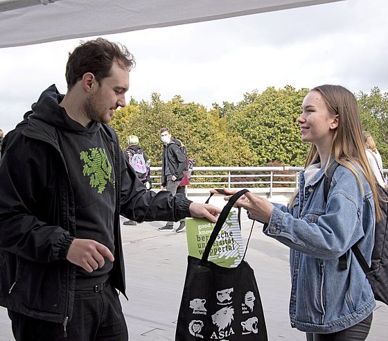 Der AStA verteilt Erstibeutel an die neuen Studierenden.