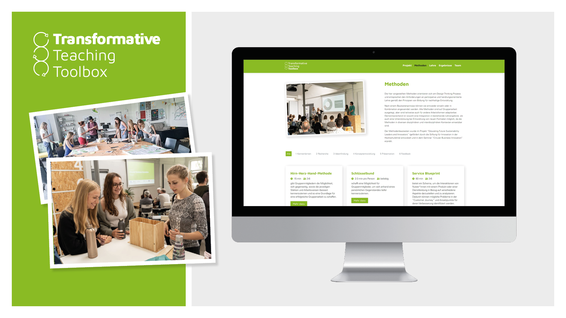 Die Transformative Teaching Toolbox wurde als Methodensammlung im Rahmen des Projektes „Educating Future Sustainability Leaders & Innovators“ entwickelt. Ziel des Gesamtprojekts war die Konzipierung und Durchführung einer transdisziplinären, interaktiven und handlungsorientierten Lehrveranstaltung, die die unternehmerische Bildung für nachhaltige Entwicklung in den Mittelpunkt stellt. Masterstudierende erlernten – unter Einbezug der Methodensammlung – handlungsorientiert, wie sich Nachhaltigkeitstransformationen gestalten, und wie sie sie durch eigene Ideen vorantreiben können. Unternehmen, Nichtregierungsorganisationen und weitere gesellschaftliche Akteure*innen wurden einbezogen. Die Ergebnisse der Lehrveranstaltung, die unter dem Titel „Circular Business Innovation“ stattfand, sind als Good-Practice-Beispiel für den Gebrauch der Methoden ebenfalls auf der Toolbox-Webseite einsehbar.