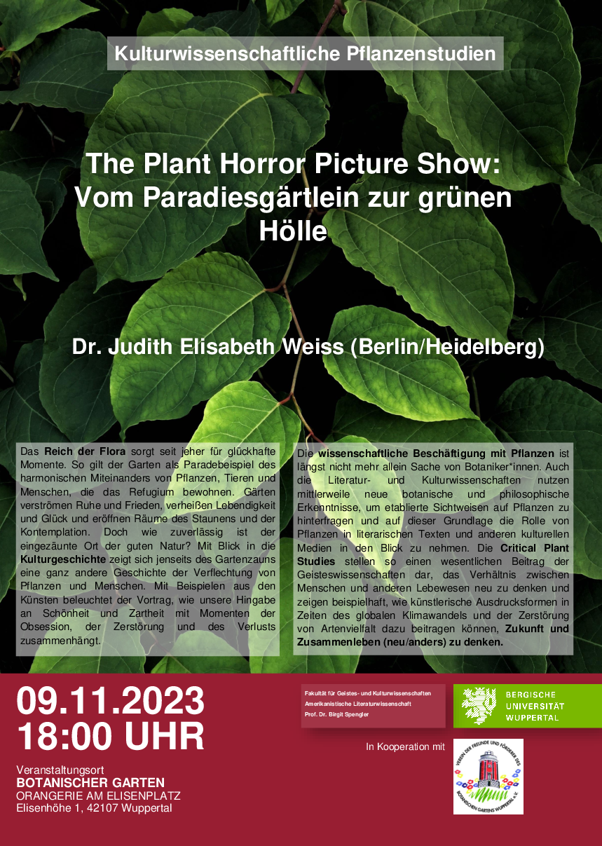 Dabei wird die Berliner Kunsthistorikerin und Ethnologin einer Verflechtungsgeschichte nachgehen, die sich in Literatur, Film und Kunst jenseits der glückhaften Momente abzeichnet, die traditionell mit Erfahrungen des Naturschönen assoziiert werden. Mit Beispielen aus den Künsten wird der Vortrag beleuchten, wie unsere Hingabe an Schönheit und Zartheit mit Momenten der Obsession, der Zerstörung und des Verlusts zusammenhängt. Die Veranstaltung ist Teil der im Sommersemester 2023 in Kooperation mit dem Verein der Freunde und Förderer des Botanischen Gartens Wuppertal e. V. und der Bergischen Universität gestarteten interdisziplinären deutschsprachigen Veranstaltungsreihe „Critical Plant Studies“.