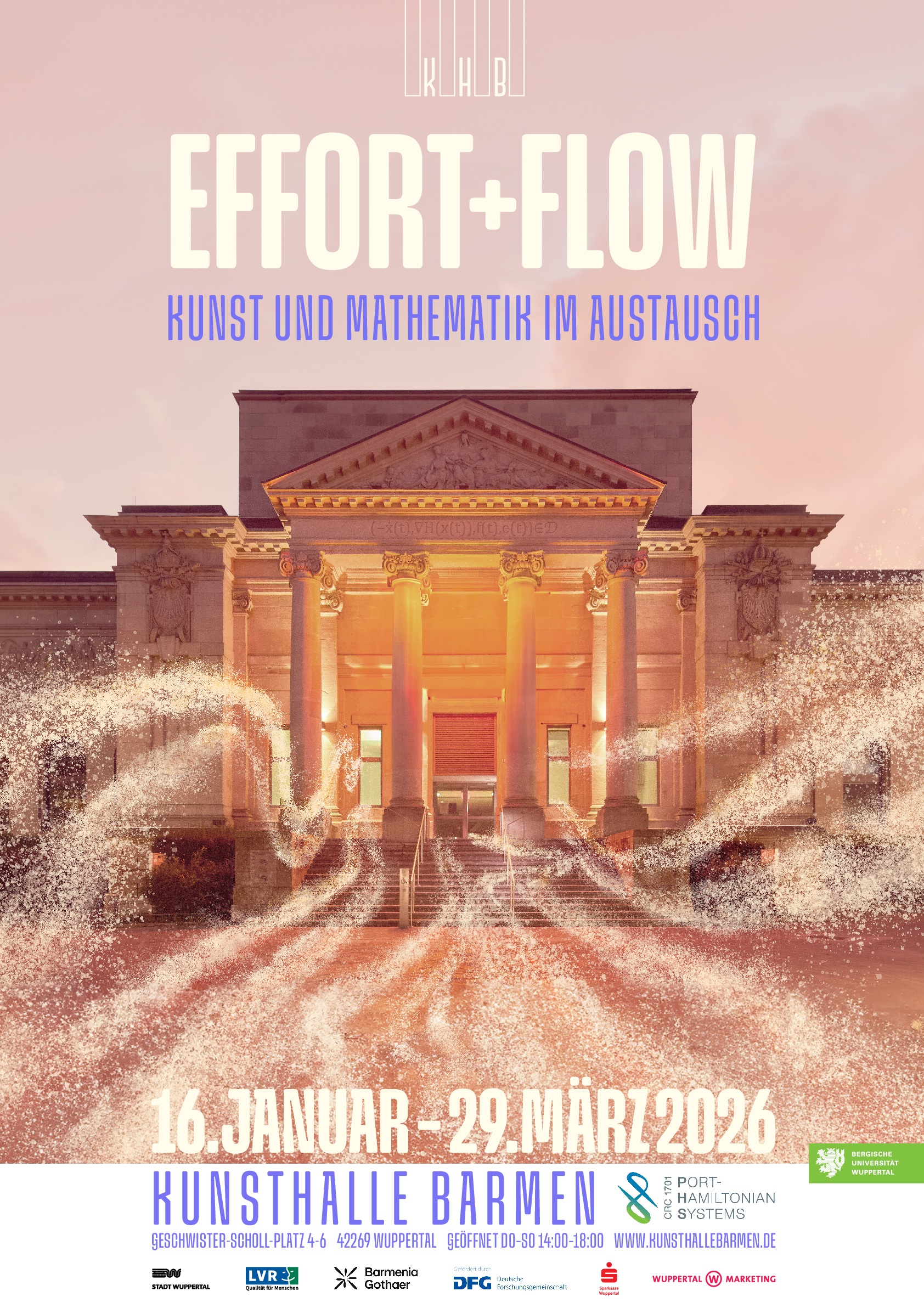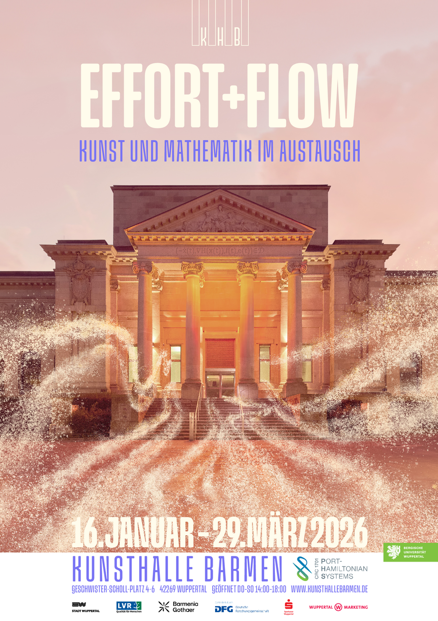 Die neue Ausstellung effort + flow – Mathematik und Kunst im Austausch führt diesen Ansatz konsequent fort. Sie entsteht in Kooperation mit dem von der Deutschen Forschungsgemeinschaft geförderten Sonderforschungsbereich Port-Hamiltonian Systems der Bergischen Universität, der an der Schnittstelle von Mathematik, Ingenieurwesen und Physik grundlegende Modelle für Energieflüsse und dynamische Wechselwirkungen erforscht. Erstmals werden diese theoretischen Konzepte in Beziehung zu künstlerischen Arbeiten gesetzt und zugleich als Impulse für gestalterische und künstlerische Forschung genutzt.