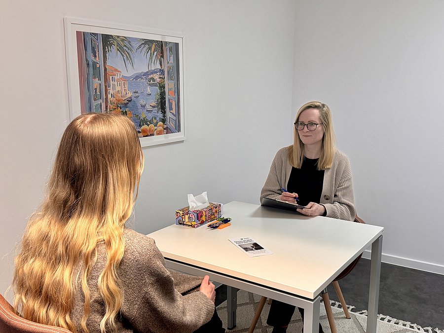Psychotherapeutin Dr. Laura Melzer (rechts) im Therapiegespräch mit einer Patientin.