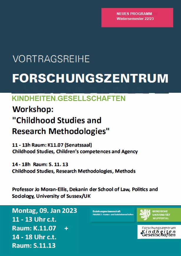 Termin: 9. Januar 2023 – Workshop "Childhood Studies and Research Methodologies"; Teil 1: 11-13 Uhr (Raum K.11.07) Childhood Studies, Children's competences and Agency; Teil 2: 14-18 Uhr (Raum S.11.13) Childhood Studies, Research Methodologies, Methods.