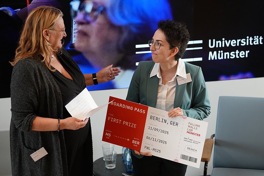 Das „Falling Walls Lab Münster“ war einer von nur drei bundesweiten Vorentscheiden für den nun anstehenden renommierten „Falling Walls Science Summit“. Der globale Gipfel findet jährlich um den Tag des Mauerfalls in Berlin statt. Zum Thema „Welche Mauern werden als nächstes in Wissenschaft und Gesellschaft fallen?“ versammelt er Gäste und führende Köpfe aus Wissenschaft, Politik, Zivilgesellschaft, Wirtschaft und Medien. Am 6. November hat Elham Iravani hier die Gelegenheit, sich mit der Konkurrenz zu messen.