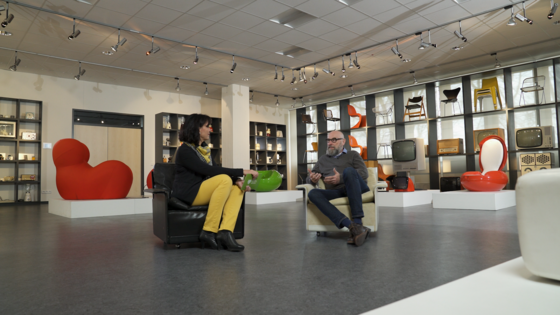 Der Industrial Designer Professor Martin Topel im Transfergespräch zum Welttag des Designs am 27. April, in der unieigenen Design-Sammlung Schriefers.