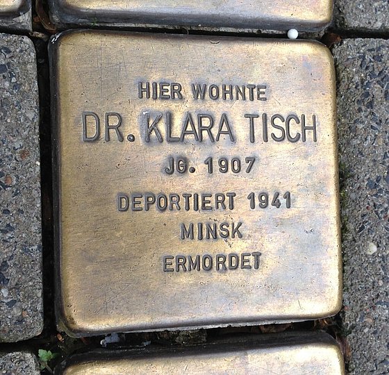 Stolpersteine sind kleine Gedenktafeln aus Messing, die an die Opfer des nationalsozialistischen Terrors erinnern. Die Stolpersteine von Cläre Tisch und ihrer Familie – das sind die ältere Schwester Marie, die jüngere, gehörlose Schwester Gerda, der Ehemann von Marie, Leo Marcus, und deren Tochter Arnhild Adele – wurden 2008 in der Neumarktstraße 8 (ehemals Hermann-Göring-Straße 46, davor Walther-Rathenau-Straße 46) in Wuppertal Elberfeld eingelassen, weiß Frambach. „Es war der Wohnort, an dem Cläre Tisch seit Verlassen ihrer Wohnung in Bonn mit ihren Angehörigen lebte. Im Anschluss an das ´Gesetz über die Mietverhältnisse der Juden` vom 30.4.1939 war Familie Tisch gezwungen, ihre Wohnung aufzugeben und in eines der sogenannten Judenhäuser in der Distelbeck 21 in Wuppertal-Elberfeld umzuziehen. Dort lebten sie bis zur ihrer Deportation nach Minsk am 10.11.1941.“