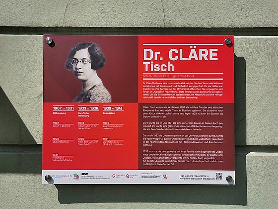 2024 erhielt Cläre Tisch im Rahmen des Projektes Frauenorte eine Gedenktafel an der Alten Synagoge in Wuppertal. „In der Feierstunde am 9. Juni 2024 wurde Dr. Cläre Tisch als erste Frau in Wuppertal mit einem offiziellen FrauenOrt NRW geehrt und als jüdische Wirtschaftswissenschaftlerin und engagierte Sozialarbeiterin im Jüdischen Frauenbund gewürdigt“, sagt Frambach abschließend. „Diese Form der Erinnerung ist ein Zeichen des Respekts, vor allem aber auch ein Aufruf, das Engagement mutiger Frauen wie Cläre Tisch nicht in Vergessenheit geraten zu lassen. Auf der Gedenktafel stehen die Worte: ´Ihr Leben steht für wissenschaftliche Exzellenz, soziale Verantwortung und den Verlust durch nationalsozialistische Verfolgung. ` Treffender kann der schicksalhafte Verlauf des Lebens von Cläre Tisch in wenigen Worten wohl kaum zusammengefasst werden.“