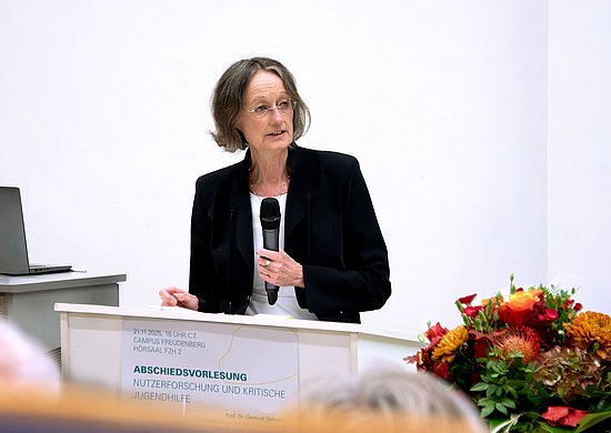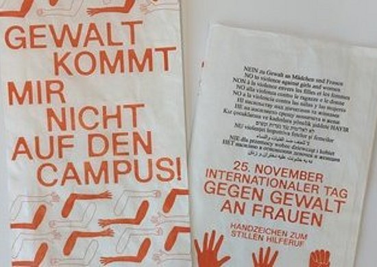 Studierende im Kreis stehend, unterhalten sich vor Unigebäude, auf einer Bank