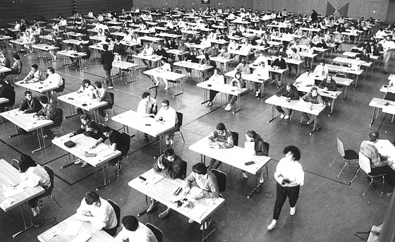 Überlastprobleme: BWL-Klausur in der Uni-Sporthalle im März 1989, Foto: Universitätsarchiv