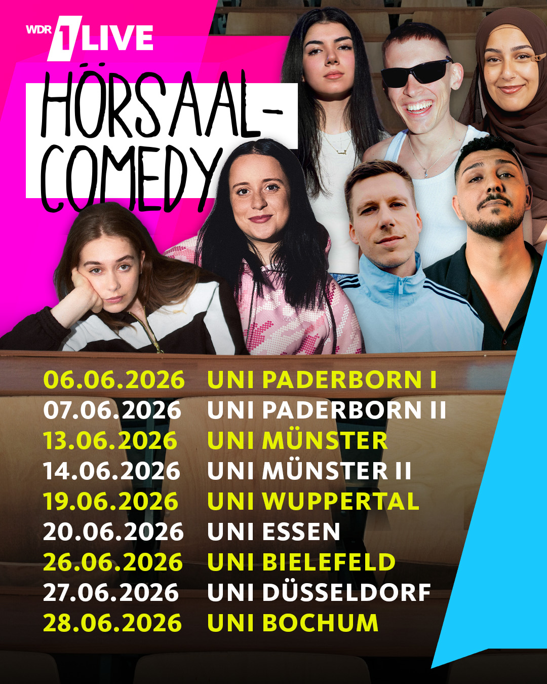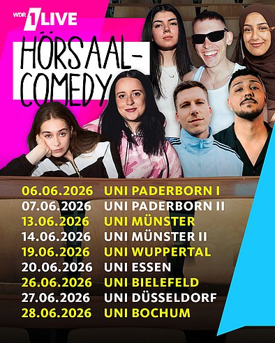 Mit neun Shows in sieben Städten tourt die 1LIVE Hörsaal-Comedy wieder durch NRW – im Gepäck bekannte Größen und spannende Newcomer*innen.