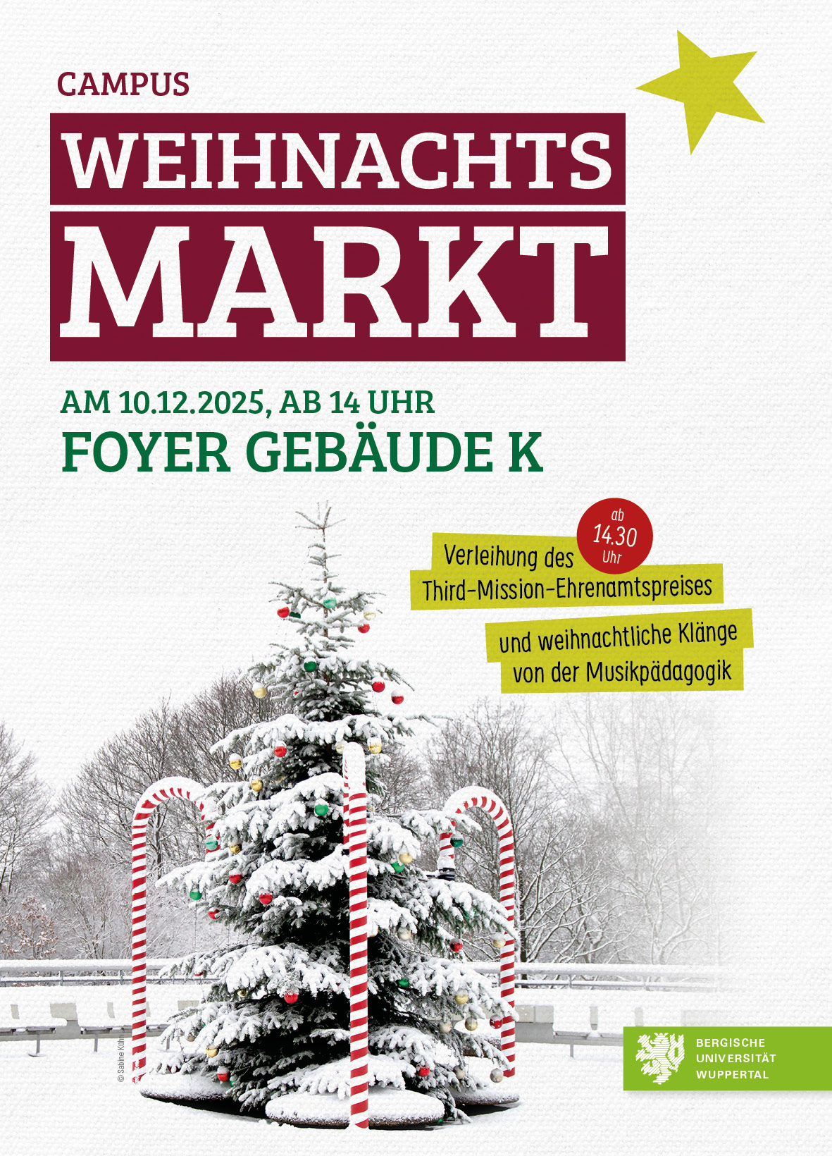 Im festlichen Rahmen findet um 14.30 Uhr die Verleihung des Third-Mission-Ehrenamtspreises im Foyer statt. Dabei wird besonderes gesellschaftliches Engagement gewürdigt, das außerhalb der dienstlichen Aufgaben oder des Studiums einen wertvollen Beitrag für die Zusammenarbeit zwischen Bergischer Universität und Gesellschaft leistet – ein schönes Zeichen für das Miteinander gerade in der Weihnachtszeit.