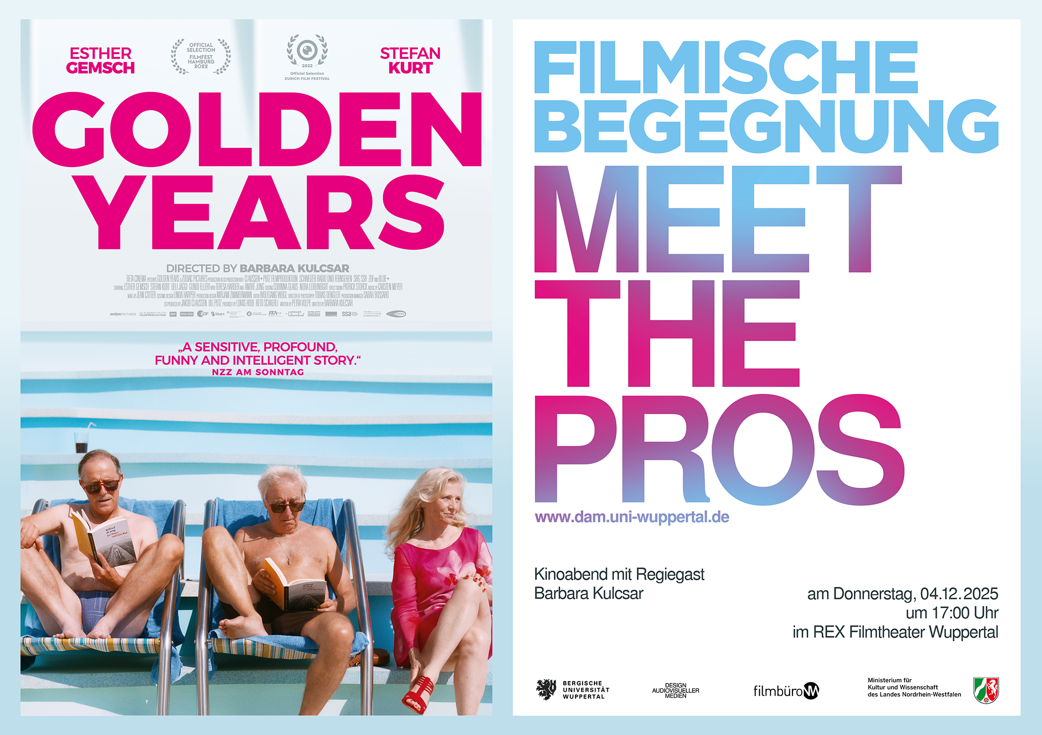 Die Veranstaltungsreihe MEET THE PROS des Filmstudiengangs Design Audiovisueller Medien lädt in Kooperation mit der Reihe FILMISCHE BEGEGNUNGEN vom Filmbüro NW e.V. zur Filmvorführung von „Die goldenen Jahre“ (2022) und anschließendem Filmgespräch mit Regisseurin Barbara Kulcsar ein.