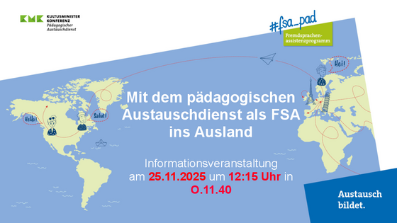 Mit dieser Veranstaltung wird das Programm der Fremdsprachenassistenz vorgestellt. Es richtet sich an alle Lehramtsstudierenden, insbesondere an jene mit einem Fremdsprachenstudium. Dabei bietet sich die Möglichkeit, an Schulen im Ausland im Deutschunterricht mitzuwirken und wertvolle Praxiserfahrungen zu sammeln. Außerdem berichte ich von meinen eigenen Erfahrungen und es gibt die Gelegenheit, Fragen zu stellen.