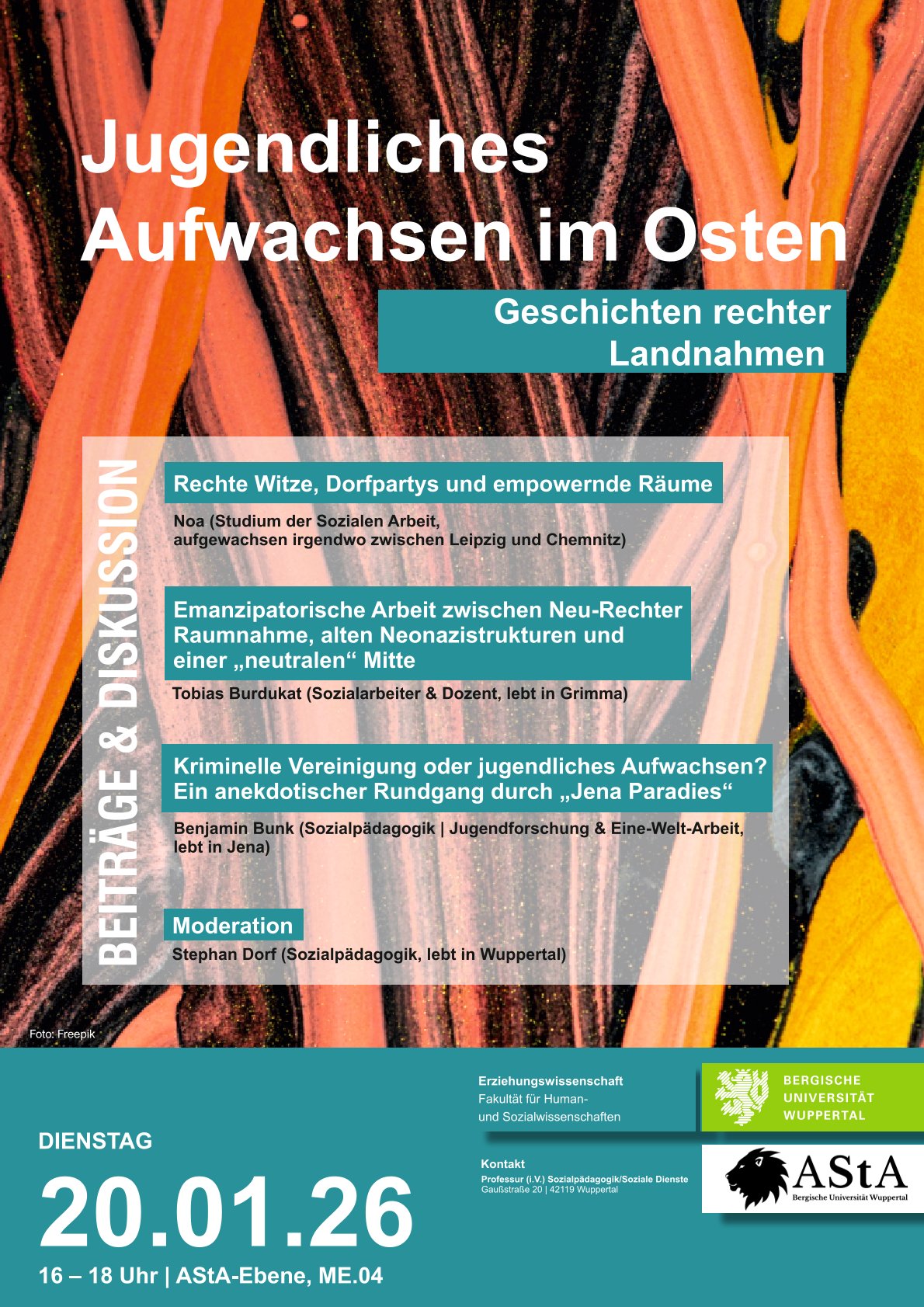 Wie wachsen Jugendliche in einem von krassen politischen Widersprüchen geprägten Umfeld auf? Was charakterisiert lokale Sozialisationsräume im Osten? Wie ist gute Sozialpädagogik möglich? Diesen Fragen wollen wir uns über lokale Geschichten aus dem Alltag an diesem Abend nähern. Wir freuen uns aufeinander Zuhören und die gemeinsame Diskussion.
