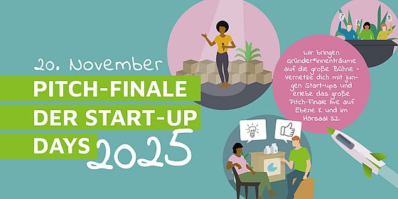 Erlebe live, wie fünf innovative Start-ups im großen Pitch-Finale gegeneinander antreten – und um ein Preisgeld von 5.500 € kämpfen! In nur 5 Minuten präsentieren die Gründer*innen ihre Ideen einer Fachjury aus Gründungsexpert*innen. Du entscheidest mit: Stimme für deinen Favoriten ab und hilf beim Gewinn des Publikumspreises! Nach der Siegerehrung gibt es Kaltgetränke, Fingerfood und Networking im Foyer von Gebäude K – die perfekte Gelegenheit, direkt mit den Gründer*innen ins Gespräch zu kommen.