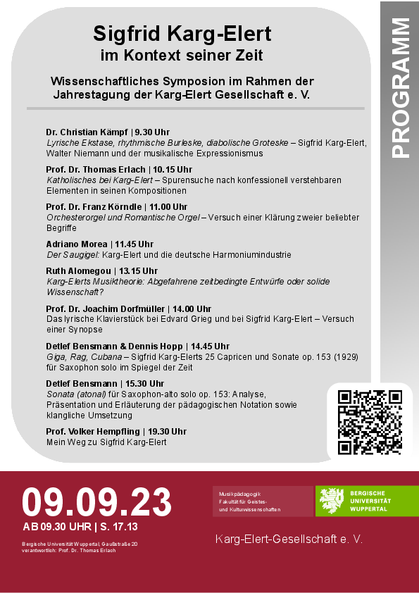 Diese musikwissenschaftliche Fachtagung widmet sich dem Leben und Werk des Komponisten Sigfrid Karg-Elert (1877-1933). Zusätzlich finden Konzerte an verschiedenen Kulturorten in Wuppertal statt. Interessierte sind herzlich willkommen!