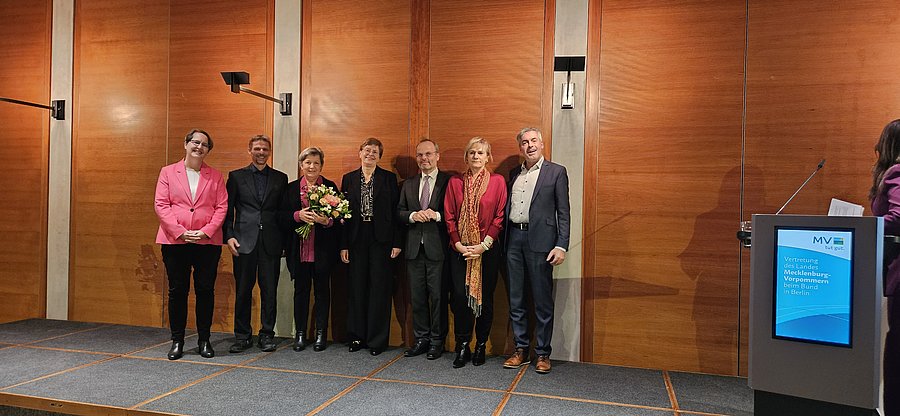 Prof. Dr. Tanja Gojny (left) and other representatives of Claudius Verlag accepted the award in Berlin from Felix Klein (5th from left), Federal Government Commissioner for Jewish Life in Germany, and Simone Oldenburg (2nd from right), President of the Conference of Ministers of Education. // Photo: BMI