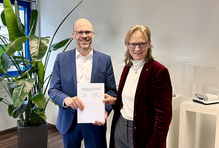Signing the contracts: Prof. Dr. Birgitta Wolff, Rector of BUW, welcomed Prof. Dr.-Ing. Clemens Rohde (left) to the University of Wuppertal. Following his appointment through the Jülich model, Rohde will serve as Professor of Economic Transformation Processes of Energy and Industry Systems. // photo Karsten Kukulies